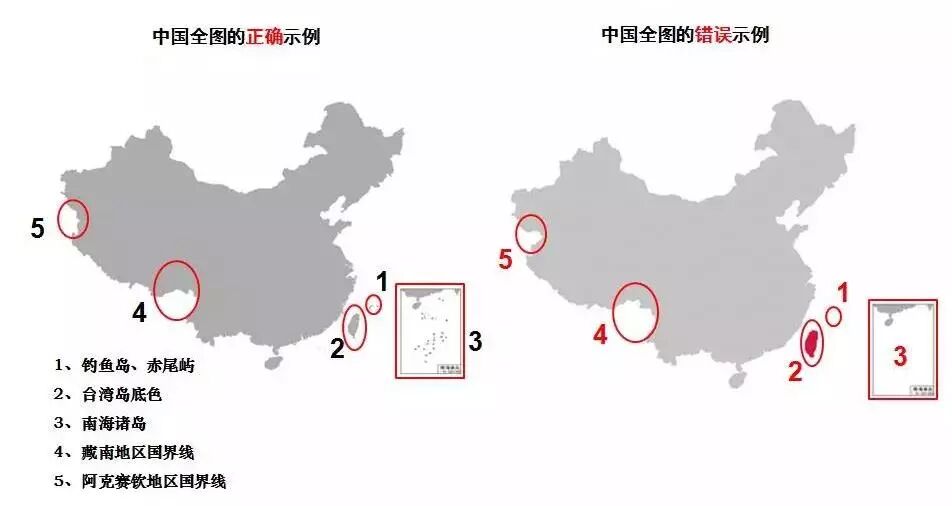 我们说的“问题地图”主要指存在危害国家主权统一、领土完整、安全和利益等严重问题的地图,“问题地图”的常见错误有漏绘钓鱼岛、赤尾屿、南海诸岛等重要岛屿,错误表示台湾省、错绘藏南地区和阿克赛钦地区国界线等。