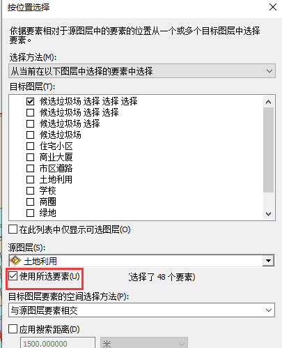 ● 按位置选择:从当前在以下图层中选择的要素中选择,1500以内。共计4个。