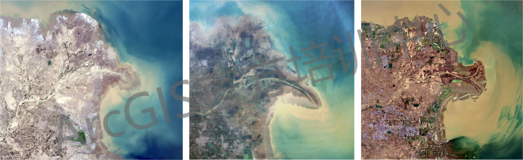 10.变化分析:黄河携带着黄土高原大量的泥沙,在山东省垦利县注入渤海。在入海口大量泥沙淤积,自然的进行了填海造陆,形成了黄河三角洲。1996年之前,黄河三角洲一直在向东南方向延伸,1996年,黄河人工改道,开始向东北方向延伸。利用30年间的影像数据,可以轻松获取变化信息,计算变化面积。
